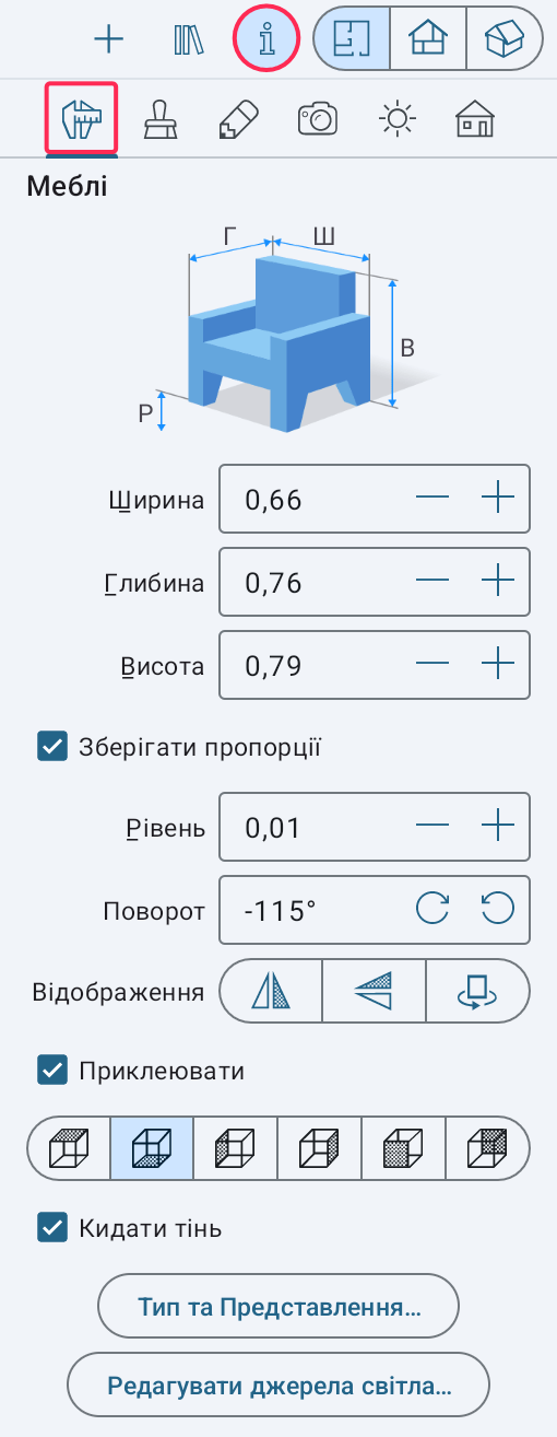 Виділіть об'єкт, щоб змінити його розмір або інші параметри. Відкрийте закладку Параметри об'єктів в Iнспектор. Доступні налаштування будуть залежати від типу обраного об'єкта.