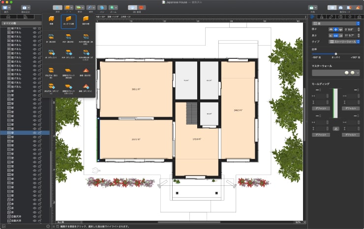 それでは、日本の家屋に欠かせないディテールについて考えてみましょう。玄関は、入口のドアから一段高くなっているところまでのエリアであり、その段の先は一般的な居住空間になっています。居住空間に足を踏み入れる前に、脱いだ靴を置けるように設計されています。これは、家をきれいに保つことを目的とした、日本に古くからある伝統です。Live Home 3D で玄関を再現するには、床(長方形)や床(ポリゴン)といったカスタム床ツールを使用します。別の方法として、建築用ブロックを使用して玄関を構築することも可能です。