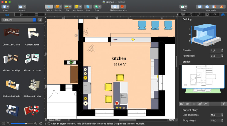 To simplify the creation of your design, you can select a professionally designed kitchen in the Gallery. The kitchen size, furniture items and materials are easily modified, so you can quickly adjust it to your needs, or you can choose to draw a kitchen floor plan from scratch.
