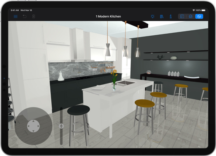 The 2D view is perfect for building the kitchen floor plan and adding furniture, annotations and measurements. If you have a digital floor plan, you can import it into the app and trace it with the program tools. If you only have a printed version of your floor plan, you can scan and import it to the program and use it as a basis for your digital plan. In this view, you can also add cameras for a movie track to create a video walkthrough of your project.