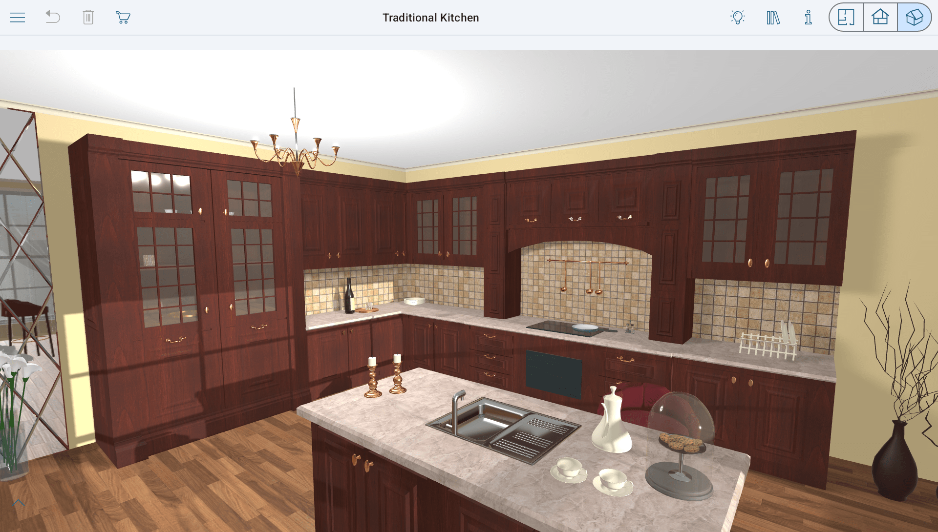 The 3D view displays a 3D model of your project. In the 3D window, you can move objects, change materials, adjust lighting and more. You can also walk around in the 3D space and take pictures.