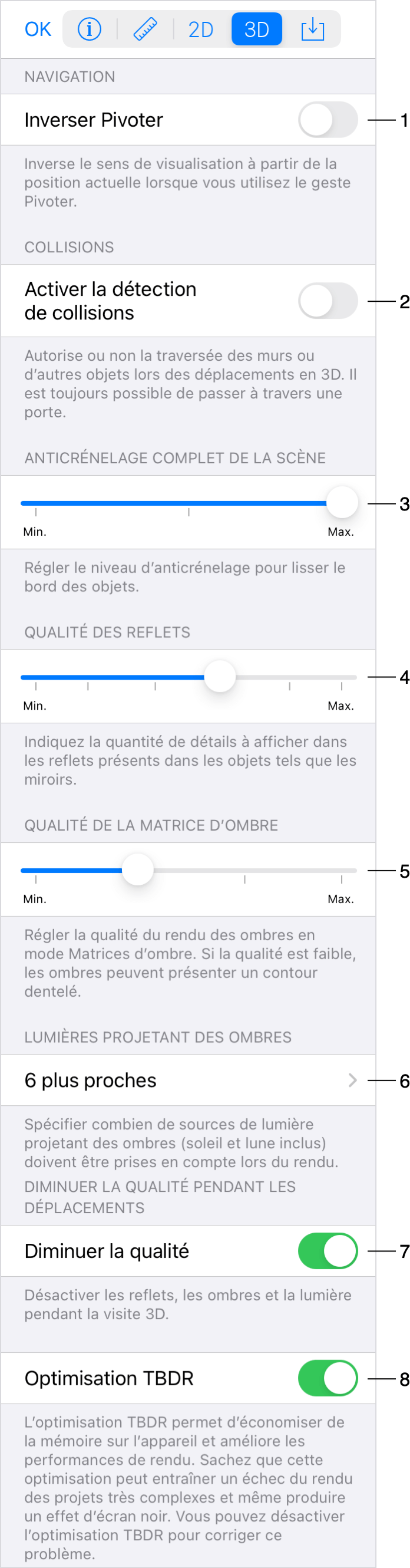 7 – L’option Diminuer la qualité désactive temporairement l’éclairage, les ombres et les reflets lorsque vous commencez à vous déplacer en 3D. L’application rétablit la qualité initiale dès que vous vous arrêtez. Cela peut augmenter les performances de manière significative. L’activation de cette option est utile lorsque vous modifiez votre projet et que vous voulez passer rapidement d’un point à un autre.