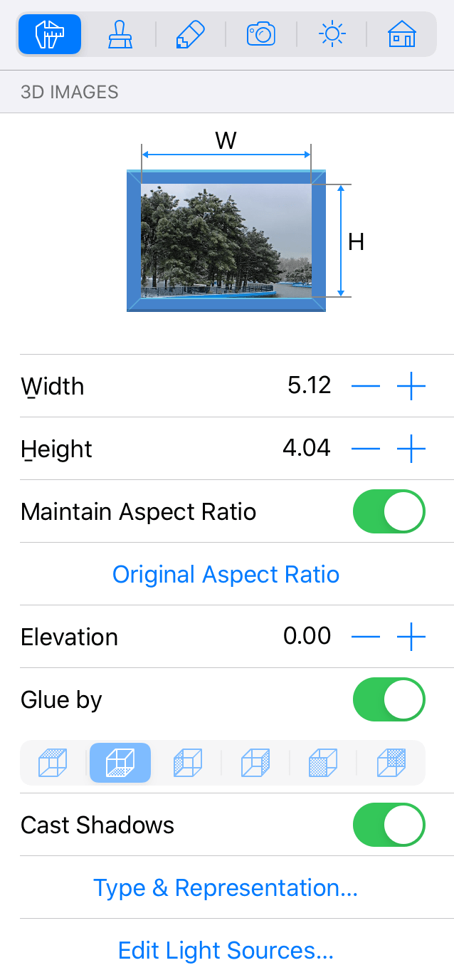 Parameters of 3D images can be found in the Object Properties tab of the Inspector. It allows you to change the object's size and elevation. You can also change the 2D representation and access the Light Source Editor.