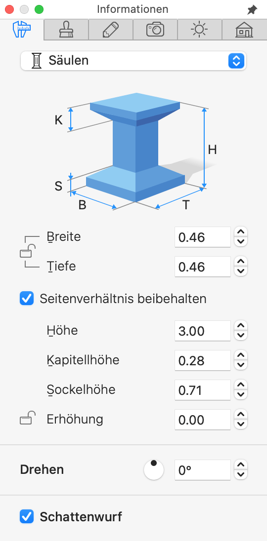 Sie können den Schatten einer Säule mit der Option Schattenwurf aktivieren und deaktivieren.