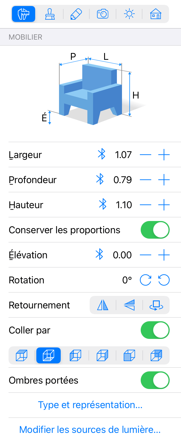 La plupart des paramètres de mobilier sont disponibles dans l’inspecteur où vous pouvez modifier les propriétés géométriques d’un objet ou configurer l’aspect des objets sur le plan ou dans la vue 3D.