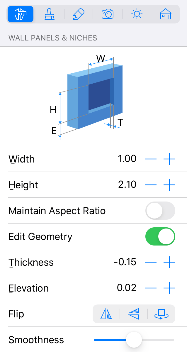 Niches and wall panels have similar properties in the app, therefore both of them will be called an "object" in this section unless we need to describe the difference between them.