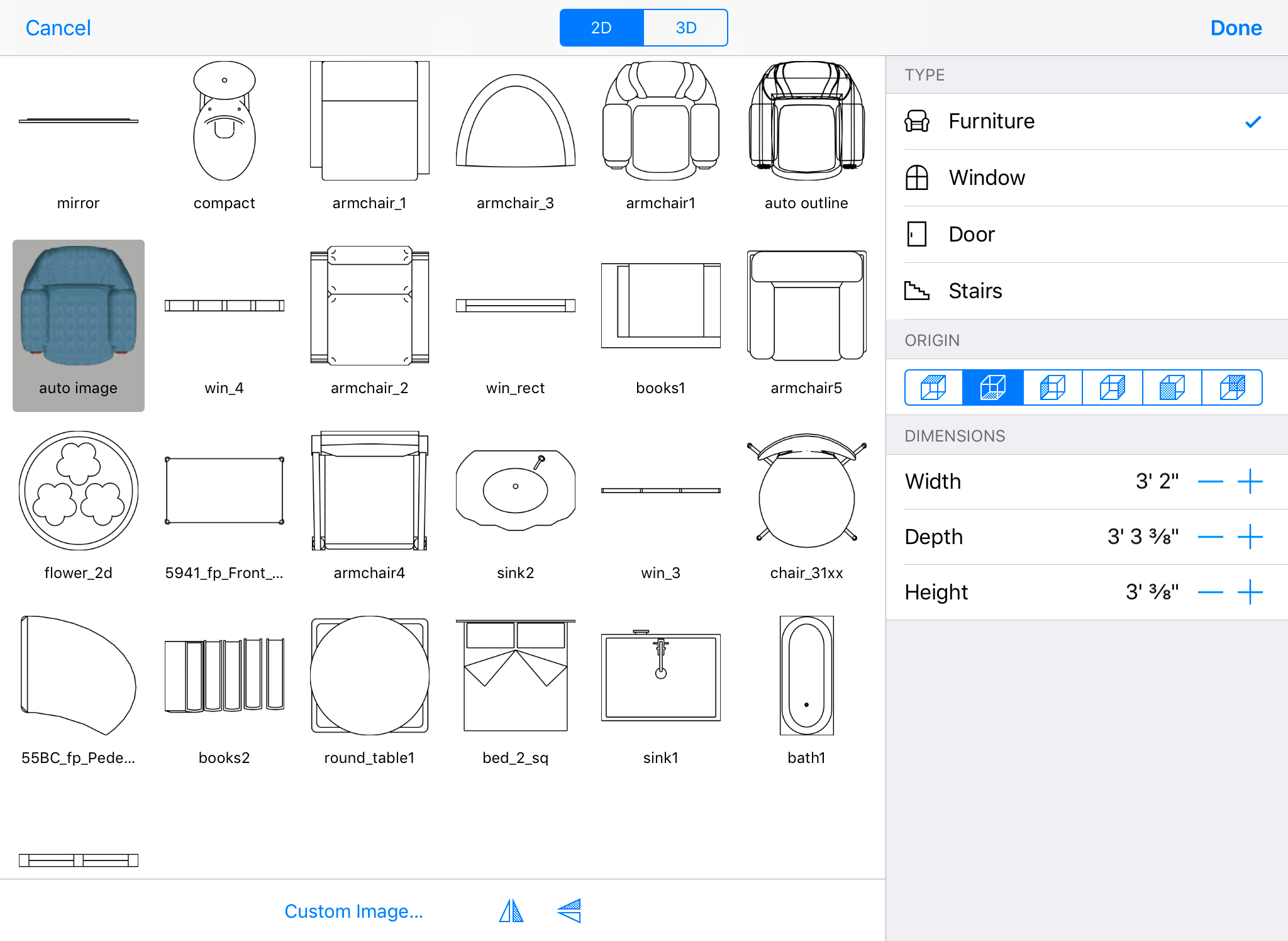 The 2D section contains a library of object representations for the floor plan. You can choose one of the standard images. The app also automatically creates two images based on how an object actually looks from the top. One of them is a vector outline. Another is a raster image that is identical to how an object looks in the 3D view.