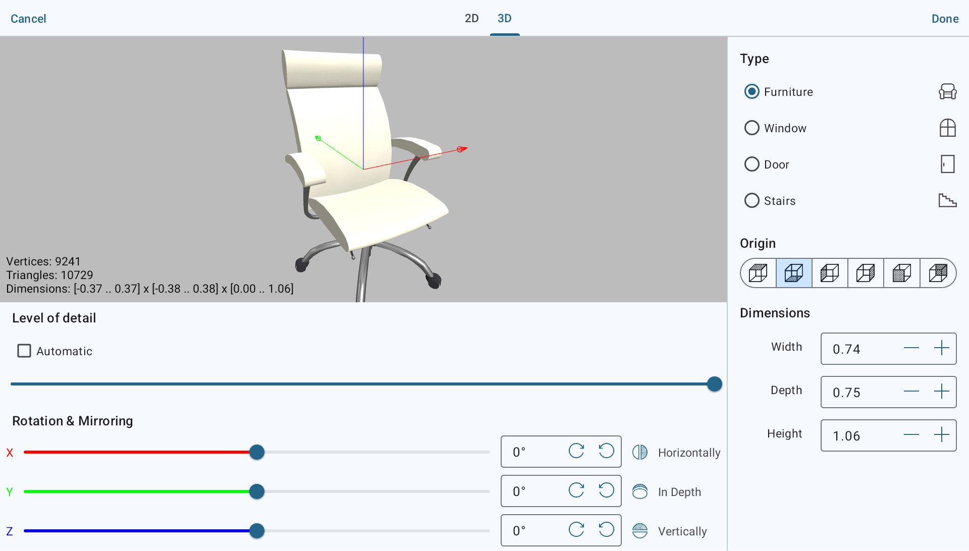 The Level of detail slide bar lets you decrease the amount of details in the 3D model. The far right position of the slider corresponds to the original object. The preview shows how the object will look in the project.