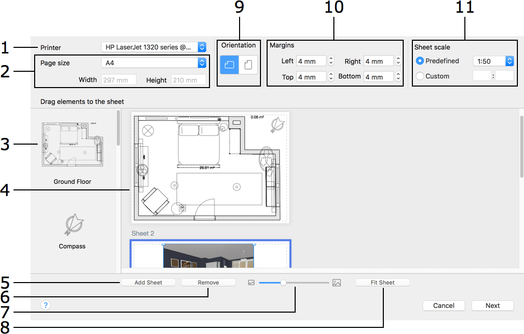 3 – Previews of all floor plans, 3D views and elevations you can print. To print any of these items, drag it onto a sheet in the middle. Each floor plan corresponds to one of the floors in your project. Each 3D view corresponds to one of the standard or user's cameras. An elevation appears in the left panel only if it was added by a user.