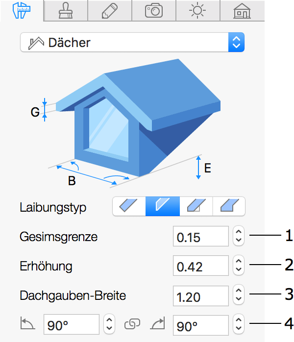 4 – Winkel der rechten und linken Dachgaubenseiten. Wenn Sie diese Winkel ändern, können Sie die Draufsicht der Dachgaube von „Rechteck“ in „Trapez“ oder „Parallelogramm“ ändern.